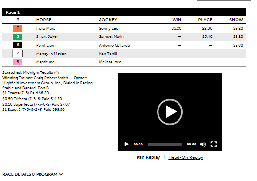 The program did well in the 1st races at Tampa Bay and Gulfstream today, having the winners in both with its first selectoins. At Tampa, #7 Indo Maria at 8-5 was the first selection with a total probabilities of 29.49%, converting to theoretical odds of 2-1. The second selection was #5 Smart Joker at 5-2, who had a total win probability of 25.64%, which converted to theoretical odds of 5-2. That was the order of finish (7-5), with #7 Indo Maria holding off Smart Joker late for the win. Not only did the program have the exacta, it hit the tri-fecta cold with #6 Point Liam being the third selection. Indo Maria paid $5.20 for the win.