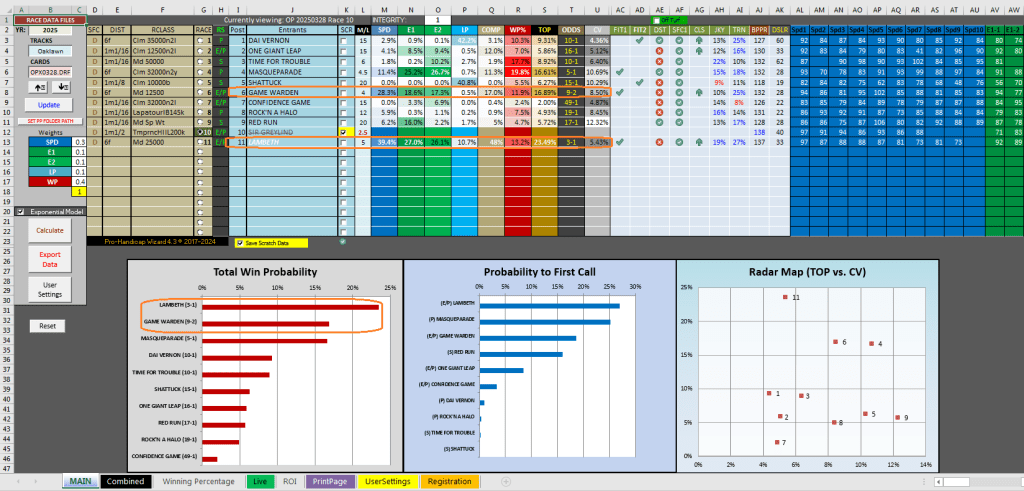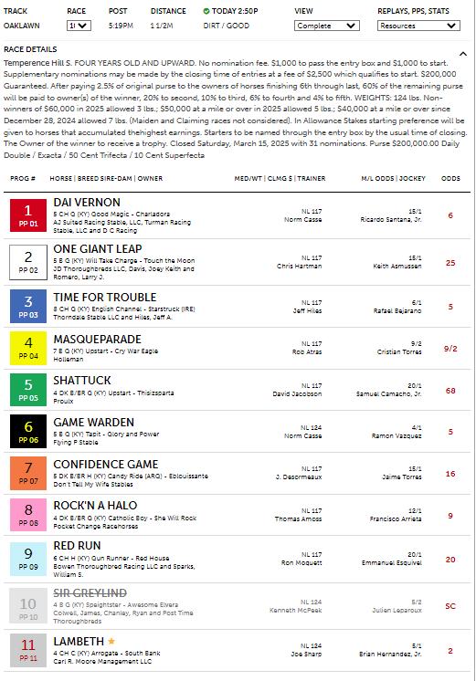 The program had a good result today in the $200K Temperance Hill Stakes in race 10 at Oaklawn (1 1/2 mi. on the dirt for four-year-olds and up), having the winner with its first selection of #11 Lambeth at 2-1. The horse had a total win probability of 22.50%, translating to odds of 3-1. In the race, Lambeth led early on through the first mile before being challenged by #6 Game Warden coming out of the far turn. Lambeth dug in in the one path down the stretch to win by two lengths. Lambeth paid $6.00 for the win. In some interations of the simulations of this race, the program had Game Warden as the second selection and the exacta order correct, 11-6. The $1 ex. paid $17.00.