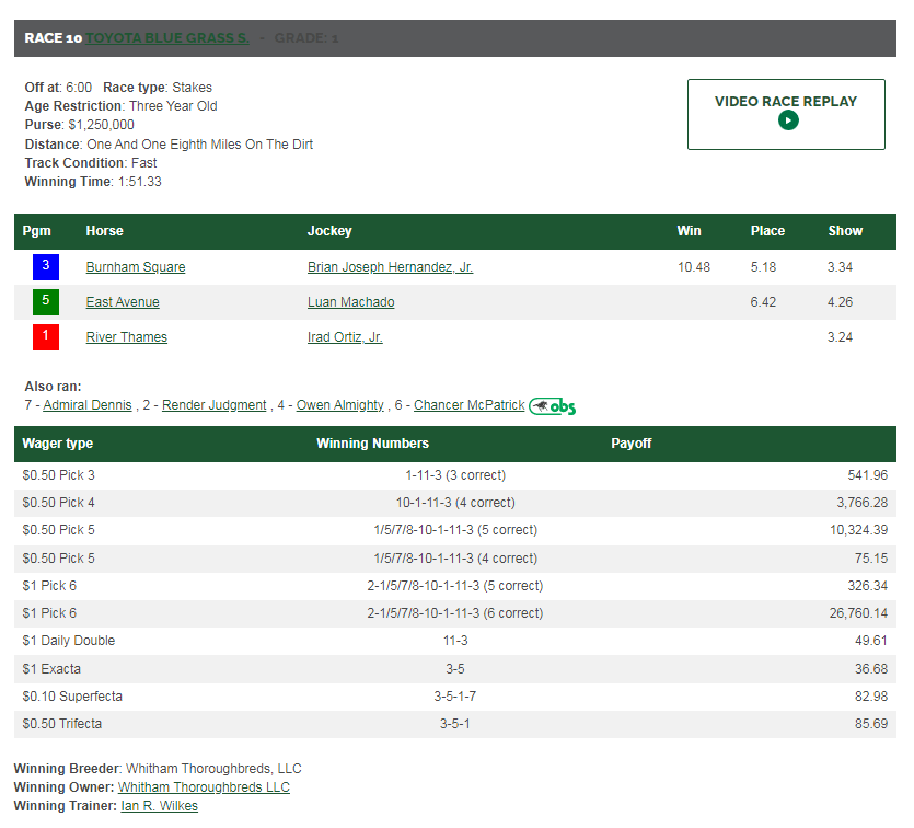 In the $1.25 mil G1 Blue Grass Stakes at Keeneland yesterday, run at 1 1/8 mi. on the dirt for three-year-olds, the program had the tri-fecta horses among its top four selections. The winner was #6 Burnham Square at 4-1, followed by #5 East Avenue at 9-2 and #1 River Thames at 3-1 . The $0.50 tri-fecta paid $85.69.