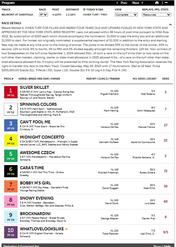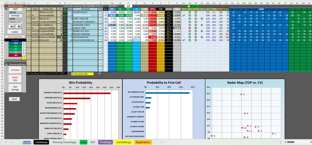 In the 9th, the $200K Mt. Vernon Stakes (run at 1 1/16 mi. on the turf for fillies and mares four-years-old and up), the Turf program had the winner with its first selections of #2 Spinning Colors at 7-1. The horse had a total win probability of 34.36%, converting to theoretical odds of 2-1. Spinning Colors projected first in final speed with a win estimate of 48.7% while having low risk with a Coeffficient of Variance of 5.97%. Additionally, the horse had a COMP value 66.3%, signaling further strength for the horse on a component level in the projections. In the race, Spinning Colors led early through opening fractions of 25 and 50 secs. The horse continued to lead around the far turn and down the final stretch, winning by two lengths in the end. Spinning Colors paid $16.20 for the win. This race was an excellent opportunity to take advantage of a horse that was clearly mispriced by the pool.
