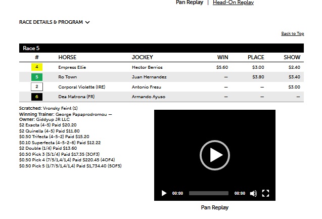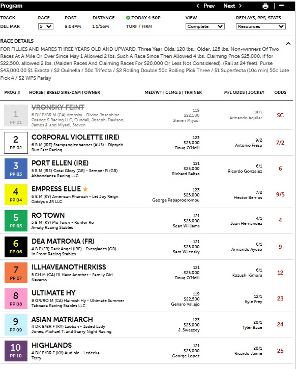The Turf Program had a nice result in the 5th today at Del Mar, a $25K claiming race at 1 1/16 mi. on the turf for three-year-old fillies and mares, having the exacta order correct with its first two selections of #4 Empress Ellie at 9-5 and #5 Ro Town at 4-1. Those final odds compare to theoretical odds of 7-2 for Empress Ellie and 4-1 for Ro Town, exactly where the horse went off at. In the race, Empress Ellie surged down the stretch to catch Ro Town at the wire. The $2 ex. paid $20.20.