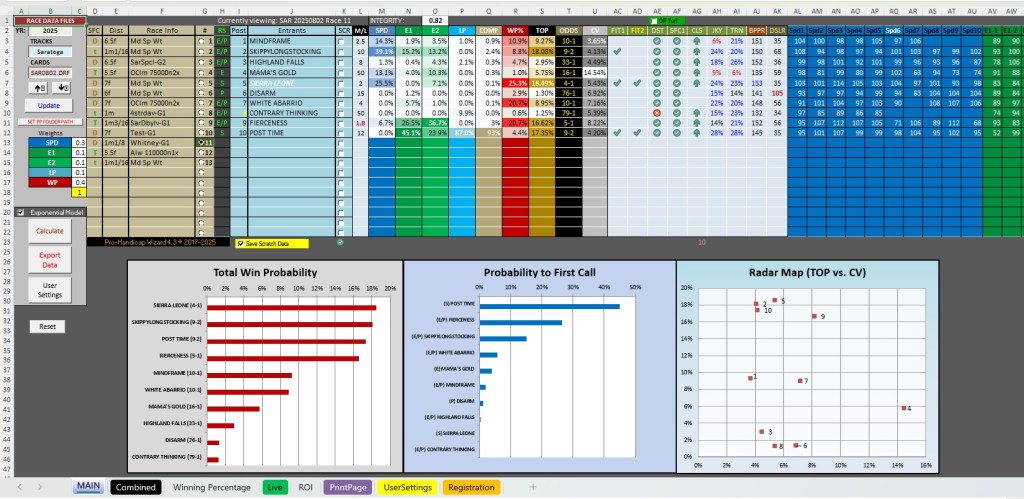 Here are the projections for today’s G1 $1 Mil. Whitney Stakes at Saratoga, run at 1 1/8 mi. on the dirt for four-year-olds and up. The program has #5 Sierra Leone as its first selection with a total win probability of 18.49%, translating to theoretical odds of 4-1. The compares to 2-1 on the M/L. Sierra Leone projects second in final speed behind Skippylongstocking with a win estimate of 25.5% while having the highest “in the money” win percentage, adjusted for stakes, at 25.3%.