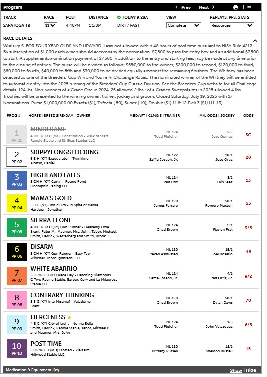 The Grey program had the winner with its first selection of #5 Sierra Leone at 9-5 in the $1 mil G1 Whitney Stakes at Saratoga today. Facing a tough field, including two Breeders Cup winners in White Abarrio and Fierceness, Sierra Leone made a wide move around the far turn and accelerated down the stretch to defeat longshot, #3 Highland Falls at 13-1, in a race that did not go as expected at all in terms of the second and third place finishers. Another long shot, #6 Disarm at 46-1, finished 3rd while White Abarrio at 4-1 finished fourth. Sierra Leone paid $5.90 for the win. To see the images in high resolution, click on the image and then on the encircled “i” in the bottom right-hand corner. Scroll down and click on the “full-size” link in the center.