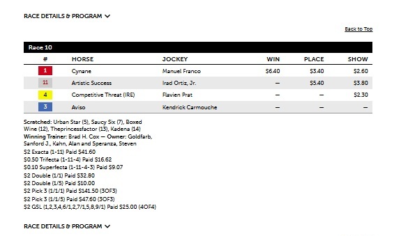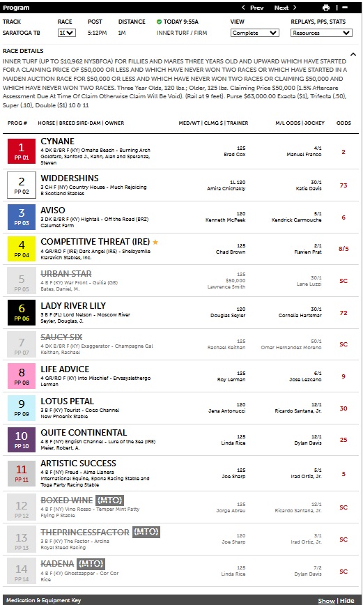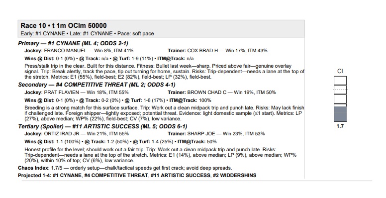 Here’s a peek at the new format covering the 10th race at Saratoga today, a $50K claiming race at 1 mi. on the firm inner turf. The program had the winner with its primary selection in #1 Cynane at 2-1 while also having the exacta and tri-fecta with its top three selections. Its tertiary (3rd) selection, #11 Artistic Success at 5-1, finished second and the secondary selection, #4 Competitive Threat at 8-5, finished third in a close finish. This is the type of success the program should have in now being calibrated to all the tracks individually with their particular signatures in sprint and route races. What this means is that the metrics (e.g., SPD, E1, E2, LP, COMP, and WP%) are all optimally configured to the track, surface and distance of the race, representing an improvement from the previous weighting system in 4.3 PHW Grey, which was static for all the tracks (though changeable). Cynane paid $6.00 for the win. The $2 exacta paid $41.60. To see the race cheat notes in high-definition, click on the encircled “i” in the bottom right-hand corner. Scroll down and then click on the “full-size” link at the bottom. The text of the race report will then become clearer.