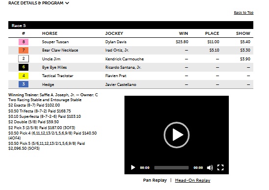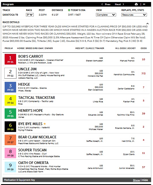 Another good result today was in the 5th at Saratoga, a $50K OC at 6 1/2f on the dirt for three-year-olds. In a tough race to handicap due to elevated chaos (volatility), as indicated by the Chaos Index (3.4/5), the program had the exacta order with its secondary selection of #8, Souper Tuscan, at 11-1 and #7 Bear Claw Necklace at 4-1. In the race, #1 Bob’s Carrot and #8 Souper Tuscan jumped out to an early lead before Souper Tuscan left Bob’s Carrot behind at the half mile pole. Souper Tuscan extended his lead coming out of the far turn until a late charge by Bear Claw Necklace, who nearly caught Souper Tuscan at the wire. The $2 exacta (8-7) paid $102. These selections are independent of the live or final odds and come purely from the program and the processed data.