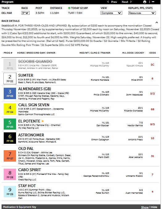 In the $200K G2 Seabiscuit at Del Mar today in race 5, run at 1 1/16 mi. on the turf for three-year-olds and up, #4 Call Sign Seven won at 68-1 in an incredible upset. However, the Chaos Index’s reading of 3.5 in the Racing Report signaled that the race would be volatile and that an unexpected result was possible. With the Racing Report for Del Mar, the user would have been able to see Call Sign Seven not only as a Chaos Pick, which appear in their own row in the the PDF when there is a high reading of the Chaos Index, but also as a Value Pick in having LP converted to odds of 4.9-1. At 68-1, the horse was offering an astronomical discount on its LP strength. Call Sign Seven’s LP into a hot pace was the difference in the race with the horse accelerating late along the rail inside the final sixteenth. The race illustrates the value of the Chaos Index in forecasting volatility in the overall race and how the user can take advantage of that predicted volatility in expanding coverage to Chaos and Value picks to find winners at big odds.
