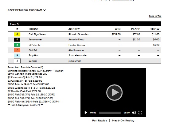 Below is video of the 9th race at Churchill, in which the primary, #5 JoeJoeGo at 10-1, won over #9 Mount Horeb at 3-2. The program assigned JoeJoeGo theoretical odds just under 3-1.