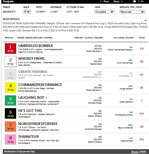 Here is a nice result in the 3rd race at Aqueduct today in a $10K claiming race at 1 1/8 mi. on the dirt for four-year-olds. The AI-enabled and track specialized program had the tri-fecta order correct with its Primary, Secondary and Tertiary selections, with the ex. horses reversed. The Tertiary horse, #2 Whiskey Frens, was a significant overlay at 30-1 while having theoretical odds around 6-1.