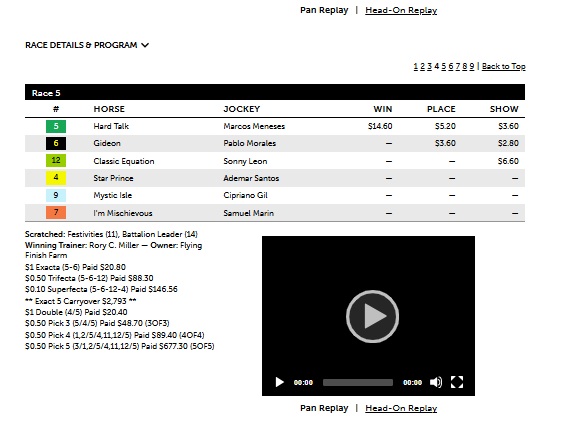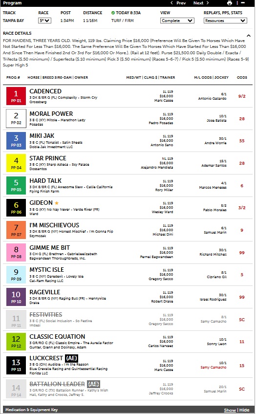 The program had good results today at Tampa Bay Downs. In the 5th, a $16K maiden claiming race at 1 1/16 mi. on the turf, the AI-enabled and Tampa specialized program had the winner with its primary selection in #5 Hard Talk at 6-1, who beat the odds favorite #6 Gideon at 6-5. With theoretical odds of 7-5, Hard Talk was a substantial overlay. The horse paid $14.40 for the win.