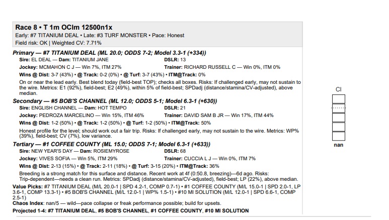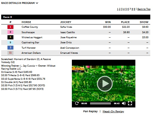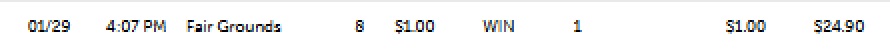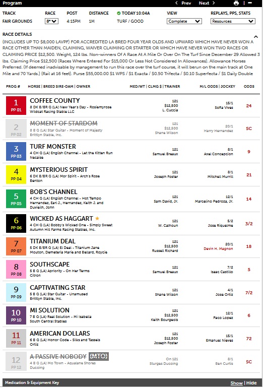 An unspoken truth of horse racing is that it pays to be lucky. Such was the case in the 8th race today at the Fair Grounds, a $12,500 OClm at 1 mi. on the turf, with #1 Coffee County pulling off a huge upset at 24-1. Coffee County made a charge from the outside late at the wire to get up before the favorite, #6 Wicked as Haggart at 3-2 and #8 Southscape at 5-1. In the Track-IQ report for the Fair Grounds, #1 Coffee Country was the tertiary selection with theoretical odds of 6-1, making the horse an overlay four times over. Notable in the race notes on Coffee Country is the mentioning of its breeding match for the mile distance: Coffee Country is a son of New Years Day, who won the Breeders Cup Juvenile in 2013 at 1 1/16 mi (and then was retired). Besides getting a clean trip on the far outside down the stretch, Coffee Country benefited from his projected field-best SPDadj (final speed adjusted for the route distance) and his late pace strength with a LP win probability of 22% (4-1 in equivalent odds). The horse was also fresh after a more than two month lay-off. Coffee Country paid $50 for the win. Placing half-sized win bets on these type of horses with the aim of diversifying can be enormously profitable, like in this race. To see the below images in full-resolution, click on it and then on the encircled “i” in the bottom right hand corner. Scroll down slightly and click on the full-size link in the bottom-left center.