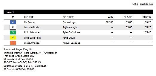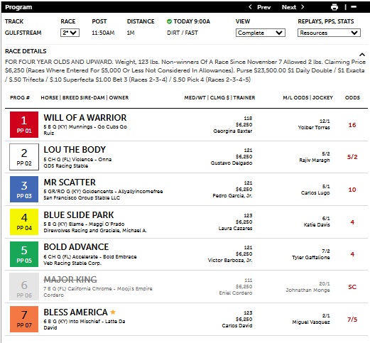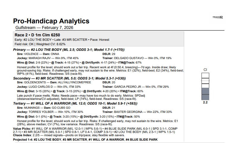 In the early going at Gulfstream, the Track-IQ report had a nice result in the 2nd, a $6250 claiming race at 1 mi on the dirt, with its Secondary and Primary selection being the exacta order at big odds. #3 Mr. Scatter at 10-1 (versus 5-1 theoretical odds) came flying late to catch Lou the Body at 2-1 (versus 2-1 theoretical odds) at the wire. The $1 ex. paid $51.10.