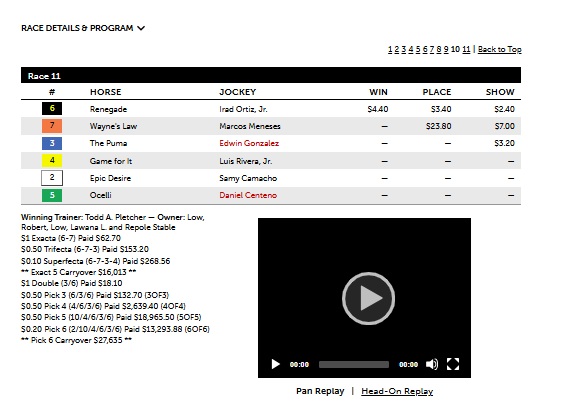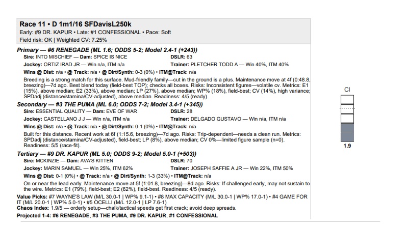 The Track-IQ report had the winner of the $250K Sam F. Davis Stakes at Tampa at 1 1/16 mi on the dirt with its Primary selection of #6 Renegade at 6-5 (versus theoretical odds of 5-2). The horse projected 2nd in final speed but had the highest win percentage, adjusted for stakes, in the field at 18%. Though the horse had variance, it was good variance in that the horse had increased its last two final speed figures dramatically. Normally, horses are penalized for variance with their theoretical odds but not for having positive trend variance, which is typical of young three-year-old horses who are still growing and maturing.