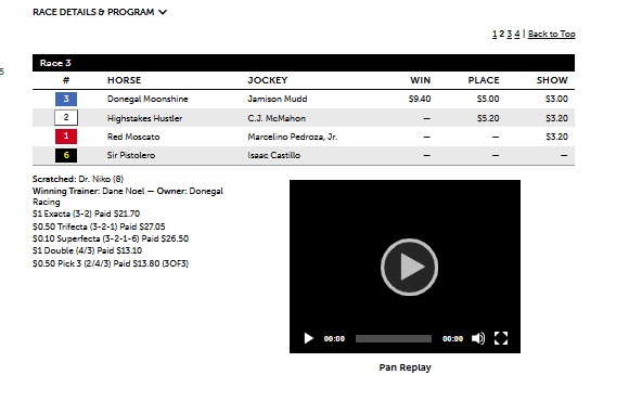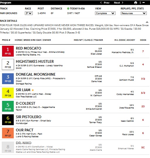 Ahead of the Risen Star Stakes at the Fairgrounds this weekend, the Track-IQ framework had an excellent result in the 3rd race today, having the exacta order correct with its Primary and Secondary selections of #3 Donnegal Moonshine at 7-2 and #2 High Stakes Hustler at 4-1. That was near their theoretical odds of 3-1 and 4-1. This was also a race in which there was a heavy favorite in #4 Sir Liam at 3-2. Donnegal Moonshine paid $9.40 for the win and the $1 ex. paid $21.70.