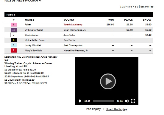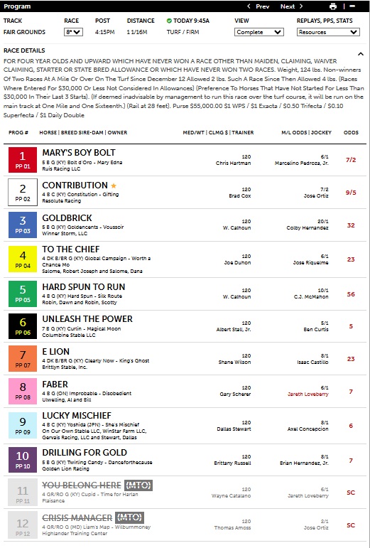 In relation to the additional notes on Track-IQ that were just released, a good example of how Field Risk can be used to one’s advantage was seen in the 8th race at the Fairgrounds, a $55K Alw at 1 1/16 on the turf. The Field Risk of only 5.38% indicated high confidence in the Primary/Secondary/Tertiary picks as whole, including #8 Faber at 7-1 versus 4.3-1 theoretical odds. According to the metrics, #8 Faber was a gift at 7-1 in having a 76% SPD , 23% E2, and 28% LP win probabilities (projected in the simulation), in addition to low Coefficient of Variance of 4.0%. So in this race with the low Field Risk, expanded win coverage to Faber as the Secondary choice at 7-1 was absolutely warranted and turned out to be profitable. Here taking low risk with a relatively high win probability of about 19% (Faber’s 4.3-1 odds) was met with high reward. The horse paid $16.60 for the win.
