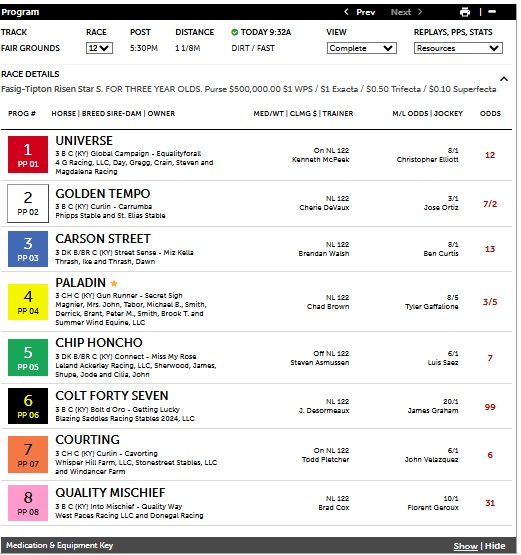 On Saturday at the Fair Grounds, the Track-IQ framework had the winner in the G1 $500K Risen Star Stakes with its Primary selection in #4 Paladin, who was not the lights out favorite his 3-5 odds suggested; rather his 3-1 theoretical odds were more appropriate after barely beating #5 Chip Honcho at 7-1 at the wire. Chip Honcho was the 4th selection in the ordering. The framework did have the superfecta ordering correct with its 1 – 4 horses with #1 Universe, the third selection, coming in fourth.