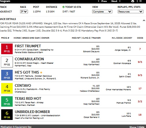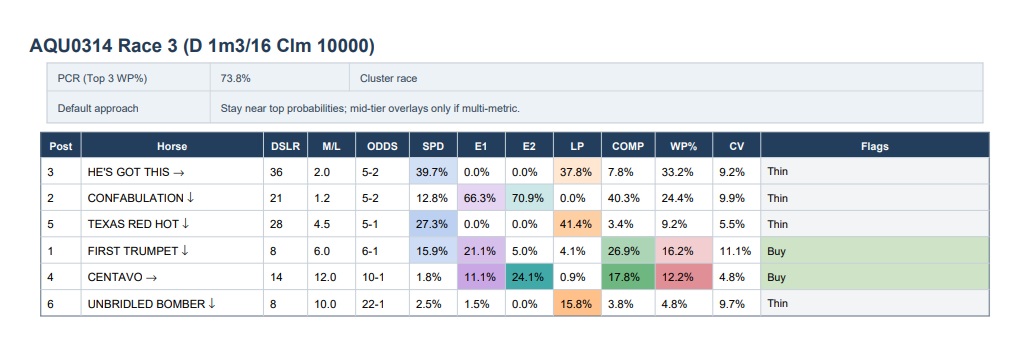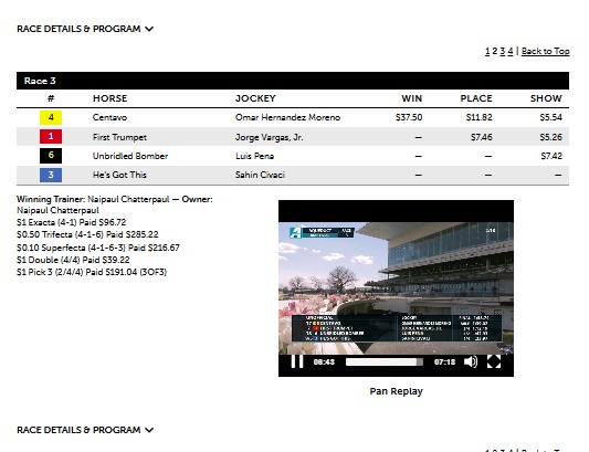 The Overlay Map had a nice result in the 3rd race today at Aqueduct, a $10K claiming race at 1 3/16 mi. on the dirt. The two horses that were flagged as buy (discounted Win Percentage adjusted for stakes relative to their M/L), #1 First Trumpet at 7-1 and #4 Centavo at 17-1, came in 2nd and 1st, respectively, at big prices while defeating two favorites at 8/5 each and a third horse at 2-1. Centavo made a three wide move around the far turn and then took the lead at the top of the stretch before going on to win by four lengths. Centavo paid $37.50 for the win. Again. this race shows that outcomes are not controllable but good risk taking is and it can lead to profitable results.