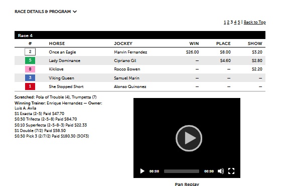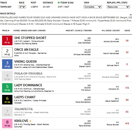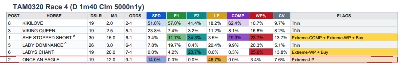 It’s often a mystery to many horseplayers and casual observers how to find winning mid to low-tier horses or those priced in high single digits to low double-digits. It’s not a mystery when the math is right. The Track-IQ Overlay Map is precisely the type of tool that illuminates opportunities with such horses by comparing their metrics, converted to odds, to their M/L prices. The Overlay Map goes even so far as to flag such horses in the case of extreme signals and color shade them according to the degree of undervaluation for a given metric. In race 4 at Tampa, a $5K claiming race at 1m 40y on the dirt, the Map flagged #2 Once an Eagle at 12-1 for Extreme LP. The horse’s LP and SPD win probabilities were 46.7% (about 2-1 equivalent strength) and 14% (6-1 equivalent strength). Light however was the horse’s WP at 3.4%. To take this horse would be a play on his form versus the field rather than on his historical win percentage. In the race, the horse did not disappoint down the stretch, turning it on inside the last sixteenth in the center of th track to get the upset. Once an Eagle paid $26.00 for the win.