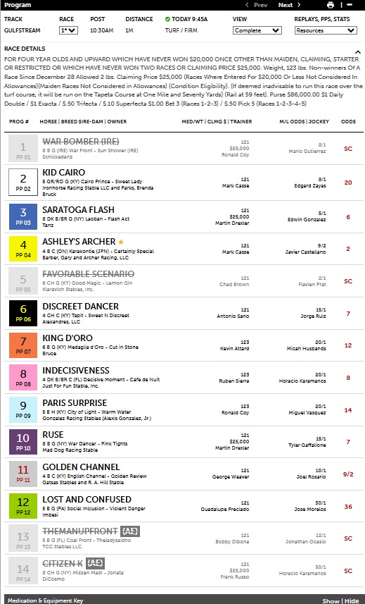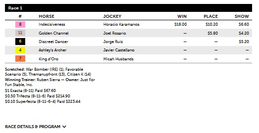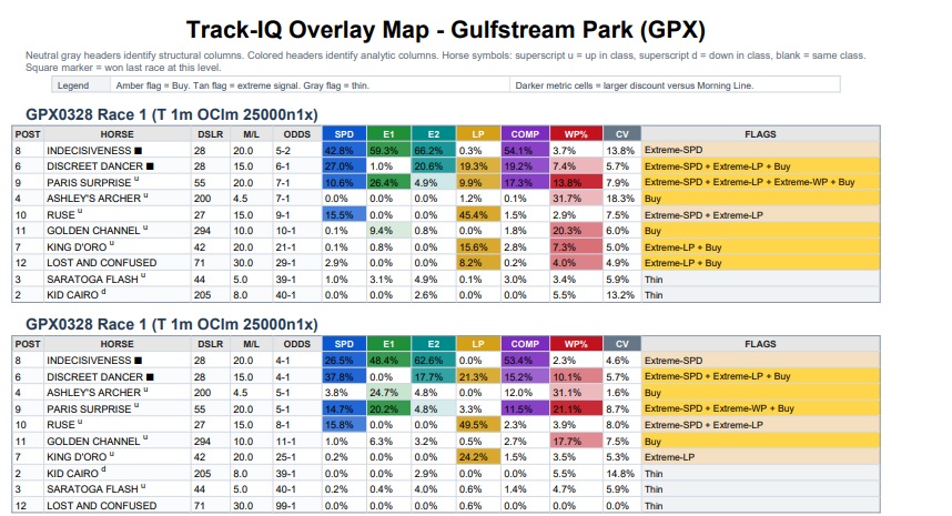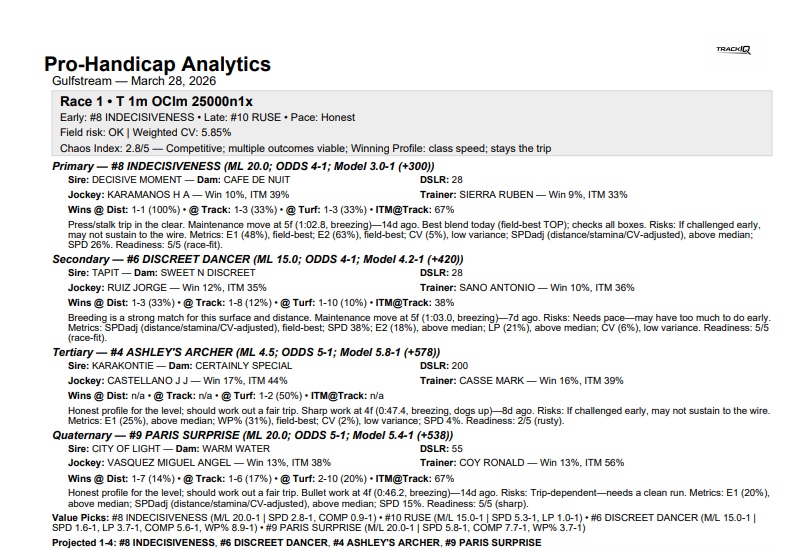 The Track-IQ framework got off to a great start on Florida Derby day, having the winner with its Primary selection of #8 Indecisiveness at 8-1 in the first race, a $25K OClm at 1 mi. on the turf for four-year-olds. Indecisiveness had fair-value odds of 3-1 according the Track-IQ report. He was the speed in the race with E1 and E2 win probabilities of 48% and 63% and had SPD win probability of 26% (3-1 strength in terms of odds) while having low risk with a Coefficient of Variance of 5%. The horse did not disappoint, going to wire-to-wire in the win while holding off #11 Golden Channel at 9-2 inside the final sixteenth. Indecisiveness paid $18.00 for the win.