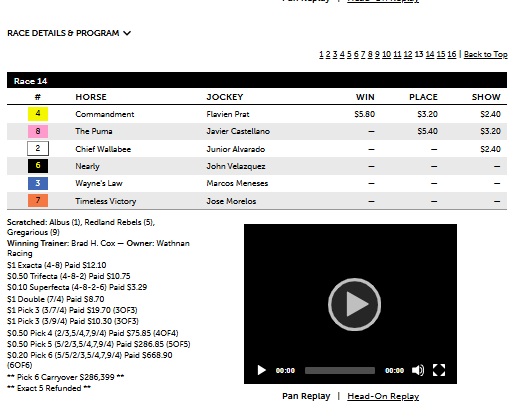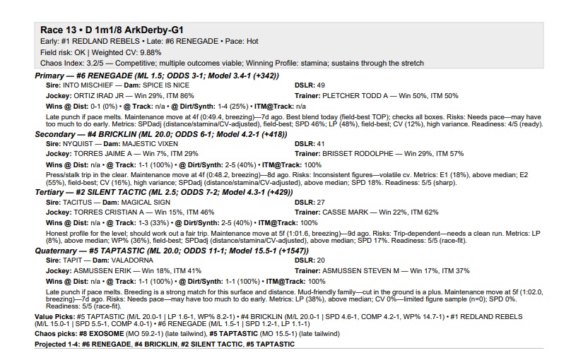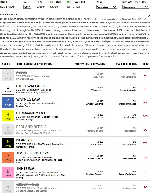 The Track-IQ framework did well today in both the Florida and Arkansas Derbies. In the Florida Derby, it identified the winner with its Secondary selection in #4 Commandment at 9-5, who was a solid choice behind the favorite, #6 Nearly at 7-5. The bettors made Nearly the clear favorite by bidding it down to 3-5 at one point before the race before the horse settled at 7-5. As mentioned on Pro-Handicap Analytics Youtube channel (under Handicapwizard), #4 Commandment had SPD win probability of 33% according to a simulation of 1000 races, signaling that the horse had 2-1 strength in current form. Those were the odds it went off at. The framework also had the place horse in #8 the Puma at 7-1 as its quaternary selection. As mentioned yesterday on the Pro-Handicap Analytics Youtube Channel in the preview video of the race, the Puma’s final speed figure in the Tampa Derby looked mighty suspect, given he ran the Derby in the same time of 1.43 and 1 that Commandment and #2 Chief Wallabee also ran the Fountain of Youth in when both races were at the same distance of 1 1/16 mi. Brisnet needs to explain that one because the 93 final speed for the Puma was clearly understated as the horse contradicted with his strong performance today. In the race, Nearly held a moderate pace going into the second turn but then faded while the Puma catapulted around the turn and took the lead midway down the stretch. Commandment flew late in the middle of the track and caught the the Puma at the wire in a photo finish. The photo was very close where you could argue that the Puma was still ahead at the wire on the inside part of the track; but the stewards gave it to Commandment. The $1 ex. paid $12.10.