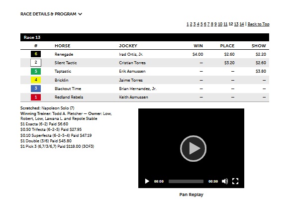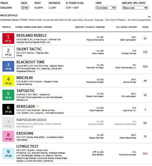 In the Arkansas Derby, Renegade was the Primary Selection and odds favorite at 4-5. Coming out of the far turn, #6 Renegade took command of the race and went on to win by several lengths over the tertiary selection, #2 Silent Tactic at 7-2, who finished second. The Track-IQ framework had the superfecta horses, with #4 Bricklan at 44-1 coming in 4th. The $0.10 superfecta paid $47.19. This result once again, shows the accuracy of the Track-IQ system.
