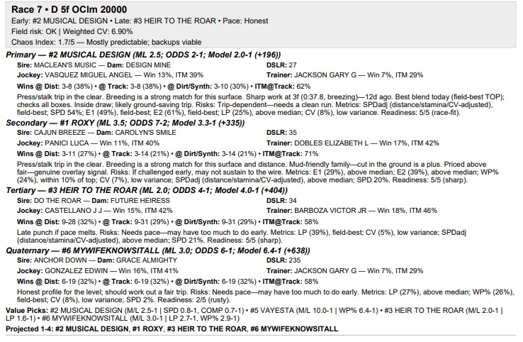 Pro-Handicap Analytics is proud to introduce the next generation of the Track-IQ Report. It now presents a complete four-horse structure—Primary, Secondary, Tertiary, and Quaternary—each with focused notes covering breeding, valuation, risk factors, key metrics, pace profile, and overall readiness—revealing how the race is likely to unfold. The Chaos Index has been elevated into its own row, paired with concise interpretation notes that instantly communicate the stability of the race and how much confidence to place in the rankings. Model odds are refined and capped for clarity, and the entire layout has been rebuilt for speed, alignment, and readability. The result is a cleaner, more complete view of race structure—one that turns complex analysis into immediate understanding and sharper decisions. Track-IQ: Next Gen. will be available beginning this Saturday and be part of the combined Report with the Overlay Lap. Below is a snapshot of race 7 at Gulfstream from today.