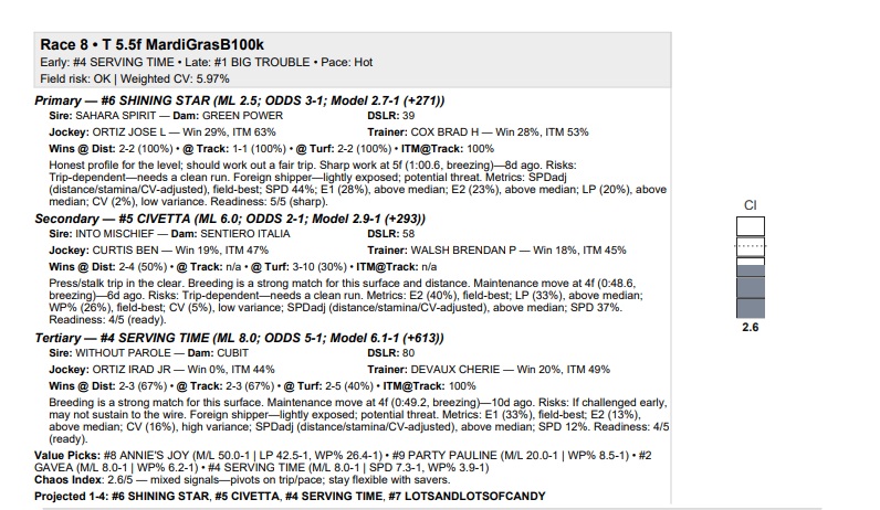 The Track-IQ framework had the winner this afternoon in the $100K Mardi Gras stakes at 5 1/2f on the turf for fillies and mares four-years-old and up with its Primary selection of #6 Shining Star (GB) at 1-2. The horse was a heavy underlay at that price versus his theoretical odds of 2.7-1 and M/L of 5-2 but was also undefeated at the track in one start and was 2-2 at the distance coming in. The Brad Cox trained horse paid $3.00 for the win.