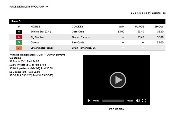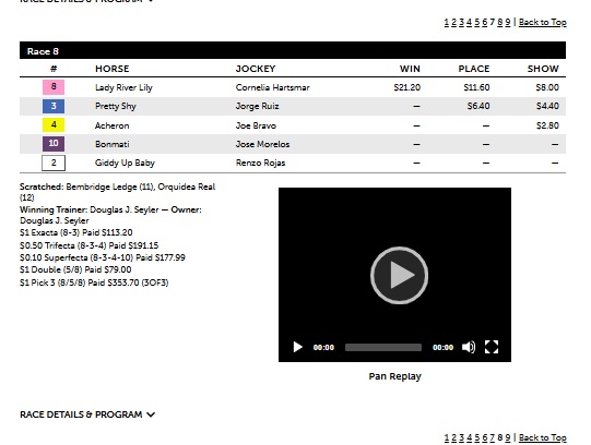 | Race | Winner (# / Name) | P/S/T Position | Win $ | Exacta | Exacta $ | Exacta in P/S/T? |