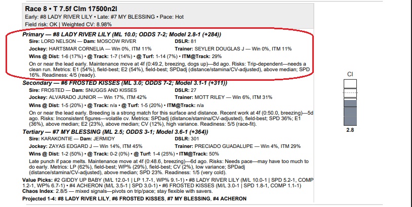 The Track-IQ framework did an excellent job in the 8th race at Gulfstream today, a $30K claiming race at 7 1/2 f on the turf for four-year-olds fillies and mares, having the winner with its Primary selection of #8 Lady River Lily at 9-1. The horse was a substantial overlay compared to her theoretical odds of 2.8-1. In a race projected to have a hot pace, Lady River Lily projected the most speed with E1 and E2 win probabilities of 54% and 54% (less that 1-1 equivalent odds). In the race, the horse led after an opening quarter of 0:23.23 and then dug in against #3 Pretty Shy at 5-1 in a gritty effort down the stretch. Lady River Lily paid $21.20 for the win.