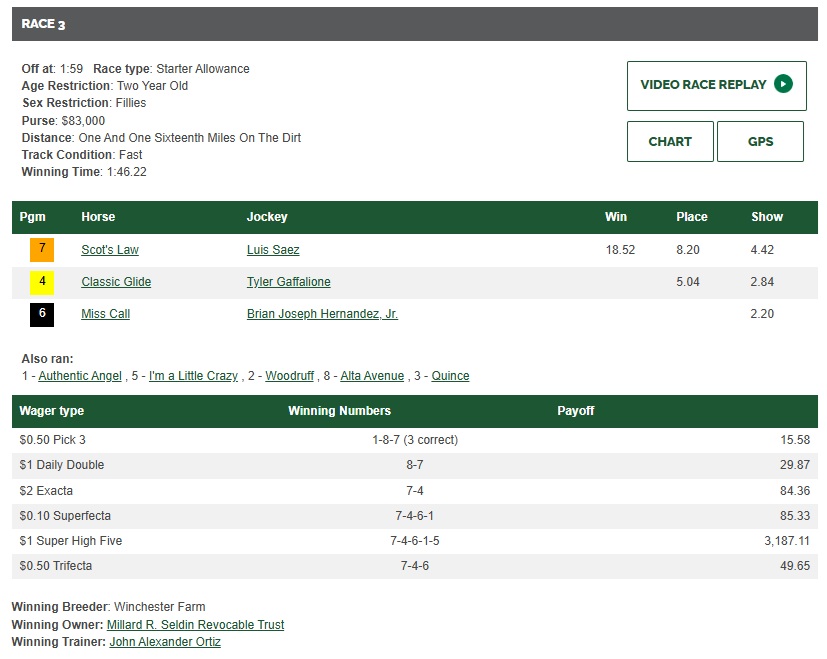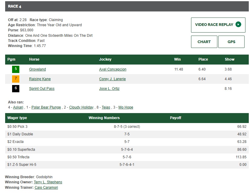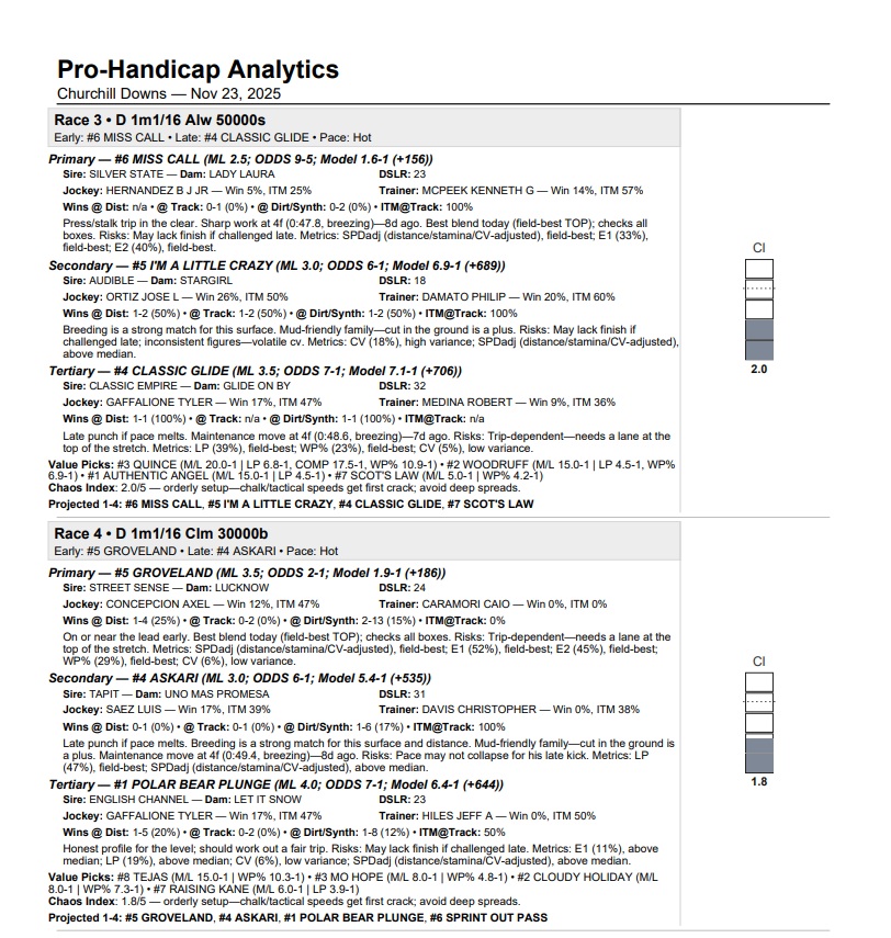 The above is the first page of the Racing Report for Churchill Downs (CDX) on Nov. 23, 2025. On this day, races 1 and 2 were excluded from consideration for being maiden races and lacking race data. Usually, mostly non-maiden races are shown in the PDF, though maiden races in certain cases will be shown when they have sufficient data. In the above example, #7 Scott’s Law was the winner in the 3rd, which had been identified as a value pick because of its discounted Win-Percentage adjusted for stakes converted to odds: ” (M/L 5.0-1 | WP%4,2-1)”. Scott’s Law final odds were 8-1/9-1, and the horse paid $18.52 for the win. In race 4, the primary selection, #5 Groveland, won at 5-1 as a significant overlay compared to Model Odds of 1.9-1. The horse paid $11.48 for the win.